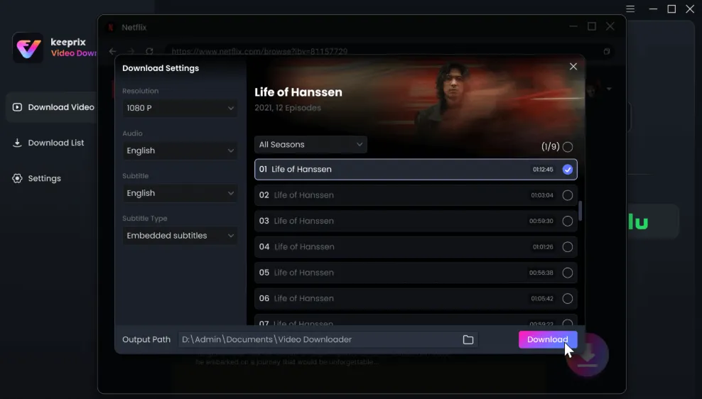 Step 4. Configure Settings: Select your preferred video quality, format (MP4 or MKV), and subtitle/audio tracks.